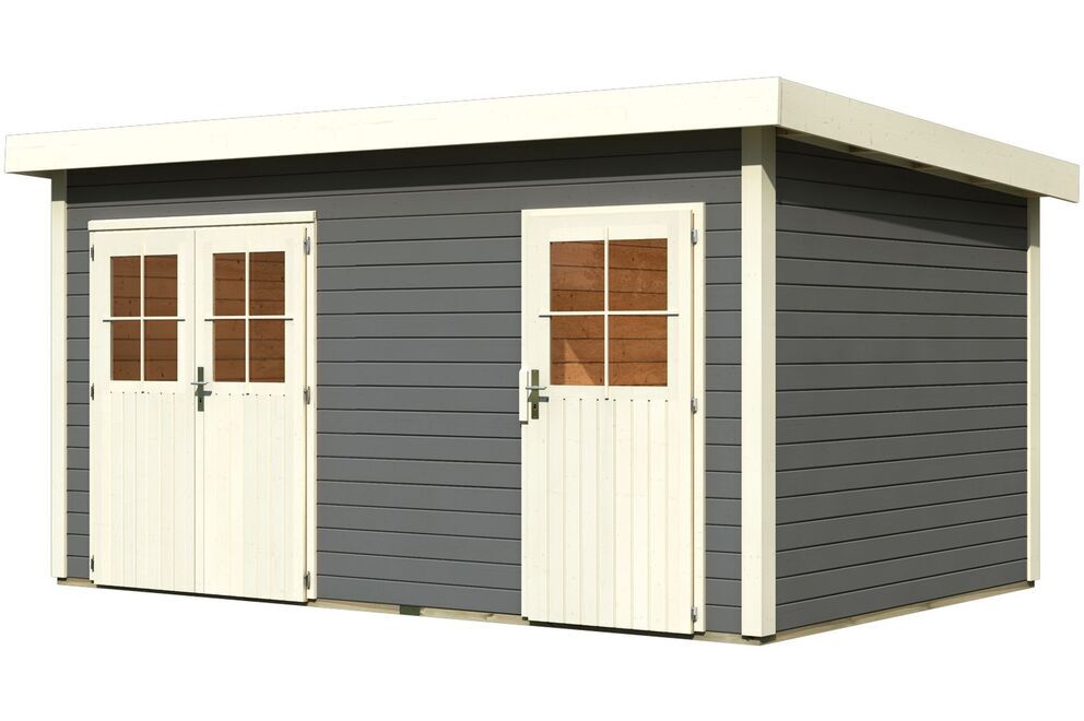 Das Gartenhaus Mattrup in naturbelassen oder terragrau aus nordischer Fichte von KARIBU wird aus 28 mm Wandbrettern im Steck-/Schraubsystem gefertigt und kann somit rasch und einfach aufgebaut werden. Dabei ist es dank der breiten Wandbretter sehr stabil. Das praktische Flachdach aus Massivholzdach sorgt dafür, dass das Gartenhaus schnell und wirkungsvoll gegen Witterungseinflüsse geschützt ist. Das Haus hat eine Grundfläche von ca. 11,34 m² und ca. 24,80 m³ umbauten Raum. Dank der Seitenhöhe von ca. 210 cm und einer Firsthöhe von ca. 230 cm sorgt das Gartenhaus innen viel Platz. Das Gartenhaus hat ein Sockelmaß von ca. 420 x 270 cm. Kesseldruckimprägnierte Bodenbalken sorgen für optimalen Schutz gegen aufsteigende Feuchtigkeit. Durch die Positionierung unter dem Gartenhaus schützen die Bodenbalken effektiv vor Staunässe und Spritzwasser. Das Gartenhaus wird mit der, praktischerweise schon vormontierten Tür, im stabilen Massivholzrahmen ausgeliefert und bietet dank der großen Öffnung bequemen Zutritt in das Haus. Nebenbei bietet sie effektiven Schutz vor Diebstahl. Gleichzeitig lassen die großzügigen Lichtausschnitte im jeweiligen Türflügel ausreichend Tageslicht in das Gartenhaus einströmen.