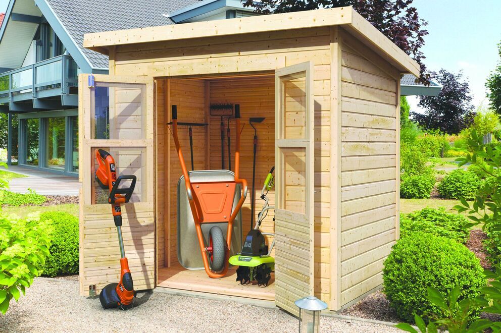Das Gartenhaus Merseburg aus nordischer Fichte von KARIBU wird aus 14 mm Wandbrettern im Steck-/Schraubsystem gefertigt und kann somit rasch und einfach aufgebaut werden. Es ist in vielen verschiedenen Größen erhältlich mit Grundflächen von ca. 2,2 m² bis ca. 5,7 m². Das praktische Pultdach aus Dachplatte sorgt dafür, dass das Gartenhaus schnell und wirkungsvoll gegen Witterungseinflüsse geschützt ist. Dank der Seitenhöhe von ca. 195 cm und einer Firsthöhe von ca. 220 cm sorgt das Haus innen für viel Platz. Kesseldruckimprägnierte Bodenbalken sorgen für optimalen Schutz gegen aufsteigende Feuchtigkeit. Durch die Positionierung unter dem Gartenhaus schützen die Bodenbalken effektiv vor Staunässe und Spritzwasser. Das Gartenhaus wird mit der, praktischerweise schon vormontierten Tür, im stabilen Massivholzrahmen ausgeliefert und bietet dank der großen Öffnung bequemen Zutritt in das Haus. Nebenbei bietet sie effektiven Schutz vor Diebstahl. Gleichzeitig lassen die großzügigen Lichtausschnitte im jeweiligen Türflügel ausreichend Tageslicht in das Gartenhaus einströmen.