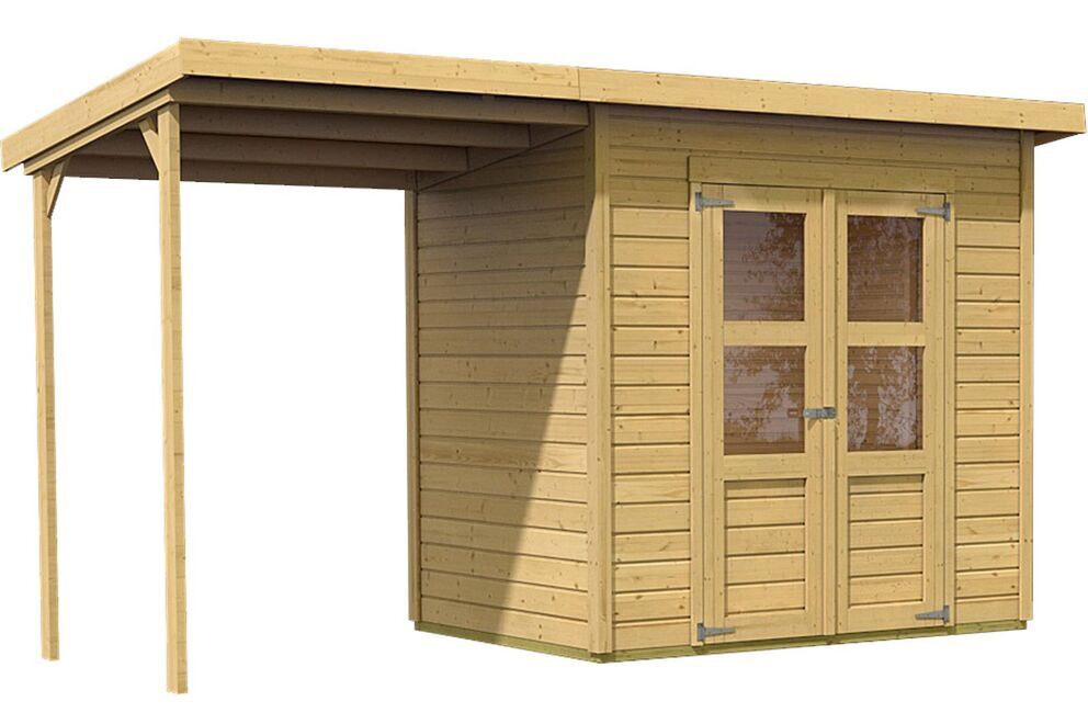 Das Gartenhaus Merseburg aus nordischer Fichte von KARIBU wird aus 14 mm Wandbrettern im Steck-/Schraubsystem gefertigt und kann somit rasch und einfach aufgebaut werden. Es ist in vielen verschiedenen Größen erhältlich mit Grundflächen von ca. 2,2 m² bis ca. 5,7 m². Das praktische Pultdach aus Dachplatte sorgt dafür, dass das Gartenhaus schnell und wirkungsvoll gegen Witterungseinflüsse geschützt ist. Dank der Seitenhöhe von ca. 195 cm und einer Firsthöhe von ca. 220 cm sorgt das Haus innen für viel Platz. Kesseldruckimprägnierte Bodenbalken sorgen für optimalen Schutz gegen aufsteigende Feuchtigkeit. Durch die Positionierung unter dem Gartenhaus schützen die Bodenbalken effektiv vor Staunässe und Spritzwasser. Das Gartenhaus wird mit der, praktischerweise schon vormontierten Tür, im stabilen Massivholzrahmen ausgeliefert und bietet dank der großen Öffnung bequemen Zutritt in das Haus. Nebenbei bietet sie effektiven Schutz vor Diebstahl. Gleichzeitig lassen die großzügigen Lichtausschnitte im jeweiligen Türflügel ausreichend Tageslicht in das Gartenhaus einströmen.