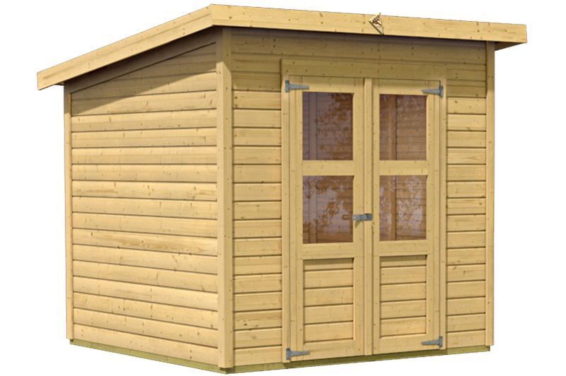 Das Gartenhaus Merseburg aus nordischer Fichte von KARIBU wird aus 14 mm Wandbrettern im Steck-/Schraubsystem gefertigt und kann somit rasch und einfach aufgebaut werden. Es ist in vielen verschiedenen Größen erhältlich mit Grundflächen von ca. 2,2 m² bis ca. 5,7 m². Das praktische Pultdach aus Dachplatte sorgt dafür, dass das Gartenhaus schnell und wirkungsvoll gegen Witterungseinflüsse geschützt ist. Dank der Seitenhöhe von ca. 195 cm und einer Firsthöhe von ca. 220 cm sorgt das Haus innen für viel Platz. Kesseldruckimprägnierte Bodenbalken sorgen für optimalen Schutz gegen aufsteigende Feuchtigkeit. Durch die Positionierung unter dem Gartenhaus schützen die Bodenbalken effektiv vor Staunässe und Spritzwasser. Das Gartenhaus wird mit der, praktischerweise schon vormontierten Tür, im stabilen Massivholzrahmen ausgeliefert und bietet dank der großen Öffnung bequemen Zutritt in das Haus. Nebenbei bietet sie effektiven Schutz vor Diebstahl. Gleichzeitig lassen die großzügigen Lichtausschnitte im jeweiligen Türflügel ausreichend Tageslicht in das Gartenhaus einströmen.