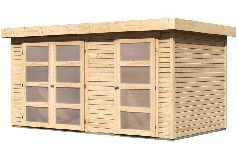 Das Gartenhaus Mühlentrup in naturbelassen oder terragrau aus nordischer Fichte von KARIBU wird aus 19 mm Wandbrettern im Steck-/Schraubsystem gefertigt und kann somit rasch und einfach aufgebaut werden. Das praktische Flachdach aus Dachplatte sorgt dafür, dass das Gartenhaus schnell und wirkungsvoll gegen Witterungseinflüsse geschützt ist. Das Haus hat eine Grundfläche von ca. 8,5 m² und ca. 17 m³ umbauten Raum. Dank der Seitenhöhe von ca. 195 cm und einer Firsthöhe von ca. 211 cm sorgt das Haus innen für viel Platz. Das Gartenhaus hat ein Sockelmaß von ca. 400 x 213 cm. Kesseldruckimprägnierte Bodenbalken sorgen für optimalen Schutz gegen aufsteigende Feuchtigkeit. Durch die Positionierung unter dem Gartenhaus schützen die Bodenbalken effektiv vor Staunässe und Spritzwasser. Das Gartenhaus wird mit der, praktischerweise schon vormontierten Tür, im stabilen Massivholzrahmen ausgeliefert und bietet dank der großen Öffnung bequemen Zutritt in das Haus. Nebenbei bietet sie effektiven Schutz vor Diebstahl. Gleichzeitig lassen die großzügigen Lichtausschnitte im jeweiligen Türflügel ausreichend Tageslicht in das Gartenhaus einströmen.