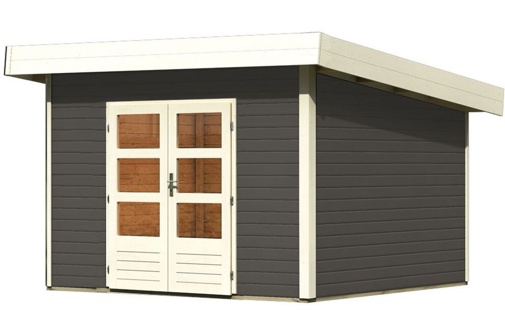 Das Gartenhaus Northeim 3 in naturbelassen, opalgrau oder terragrau aus nordischer Fichte von KARIBU wird aus 38 mm Wandbrettern im Steck-/Schraubsystem gefertigt und kann somit rasch und einfach aufgebaut werden. Dabei ist es dank der extra breiten Wandbretter mit Doppelnut und -feder extrem stabil. Das praktische Pultdach aus Massivholzdach sorgt dafür, dass das Gartenhaus schnell und wirkungsvoll gegen Witterungseinflüsse geschützt ist. Der vordere Dachüberstand ist mit ca. 31 cm ausreichend groß dimensioniert, um den Eingangsbereich wirkungsvoll zu schützen. Das Haus hat eine Grundfläche von ca. 9,3 m² und ca. 12,9 m³ umbauten Raum. Dank der Seitenhöhe von ca. 189 cm und einer Firsthöhe von ca. 238 cm sorgt das Gartenhaus innen viel Platz. Kesseldruckimprägnierte Bodenbalken sorgen für optimalen Schutz gegen aufsteigende Feuchtigkeit. Durch die Positionierung unter dem Gartenhaus schützen die Bodenbalken effektiv vor Staunässe und Spritzwasser. Das Gartenhaus wird mit der, praktischerweise schon vormontierten Tür, im stabilen Massivholzrahmen ausgeliefert und bietet dank der großen Öffnung bequemen Zutritt in das Haus. Nebenbei bietet sie effektiven Schutz vor Diebstahl. Gleichzeitig lassen die großzügigen Lichtausschnitte im jeweiligen Türflügel ausreichend Tageslicht in das Gartenhaus einströmen.