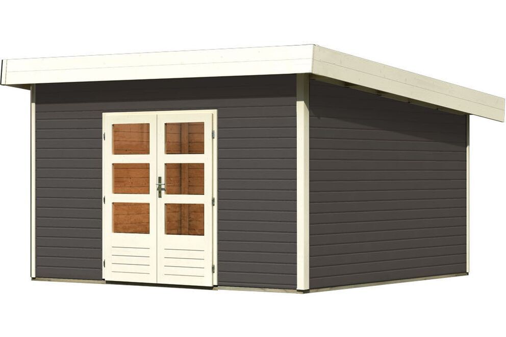 Das Gartenhaus Northeim 5 in naturbelassen, opalgrau oder terragrau aus nordischer Fichte von KARIBU wird aus 38 mm Wandbrettern im Steck-/Schraubsystem gefertigt und kann somit rasch und einfach aufgebaut werden. Dabei ist es dank der extra breiten Wandbretter mit Doppelnut und -feder extrem stabil. Das praktische Pultdach aus Massivholz sorgt dafür, dass das Gartenhaus schnell und wirkungsvoll gegen Witterungseinflüsse geschützt ist. Der vordere Dachüberstand ist mit ca. 24 cm ausreichend groß dimensioniert, um den Eingangsbereich wirkungsvoll zu schützen. Das Haus hat eine Grundfläche von ca. 13,3 m² und ca. 27,7 m³ umbauten Raum. Dank der Seitenhöhe von ca. 189 cm und einer Firsthöhe von ca. 248 cm sorgt das Gartenhaus innen viel Platz. Kesseldruckimprägnierte Bodenbalken sorgen für optimalen Schutz gegen aufsteigende Feuchtigkeit. Durch die Positionierung unter dem Gartenhaus schützen die Bodenbalken effektiv vor Staunässe und Spritzwasser. Das Gartenhaus wird mit der, praktischerweise schon vormontierten Tür, im stabilen Massivholzrahmen ausgeliefert und bietet dank der großen Öffnung bequemen Zutritt in das Haus. Nebenbei bietet sie effektiven Schutz vor Diebstahl. Gleichzeitig lassen die großzügigen Lichtausschnitte im jeweiligen Türflügel ausreichend Tageslicht in das Gartenhaus einströmen.