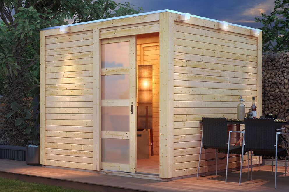 Das Gartenhaus Qubic 1 aus nordischer Fichte von KARIBU wird aus 19 mm Wandbrettern im Steck-/Schraubsystem gefertigt und kann somit rasch und einfach aufgebaut werden. Das praktische Flachdach aus Massivholz sorgt dafür, dass das Gartenhaus schnell und wirkungsvoll gegen Witterungseinflüsse geschützt ist. Das Haus hat eine Grundfläche von ca. 5,9 m² und ca. 12 m³ umbauten Raum. Dank der Seitenhöhe von ca. 201 cm und einer Firsthöhe von ca. 215 cm sorgt das Haus innen für viel Platz. Das Gartenhaus hat ein Sockelmaß von ca. 242 x 242 cm, mit Anbaudach ca. 483,5 x 242 cm. Kesseldruckimprägnierte Bodenbalken sorgen für optimalen Schutz gegen aufsteigende Feuchtigkeit. Durch die Positionierung unter dem Gartenhaus schützen die Bodenbalken effektiv vor Staunässe und Spritzwasser. Das Gartenhaus wird mit der, praktischerweise schon vormontierten Tür, im stabilen Massivholzrahmen ausgeliefert und bietet dank der großen Öffnung bequemen Zutritt in das Haus. Nebenbei bietet sie effektiven Schutz vor Diebstahl. Gleichzeitig lassen die großzügigen Lichtausschnitte im jeweiligen Türflügel ausreichend Tageslicht in das Gartenhaus einströmen. Der Türeinbau ist ebenfalls auch an der Seite möglich. Sie können dieses Modell in fünf unterschiedlichen Farben erwerben.