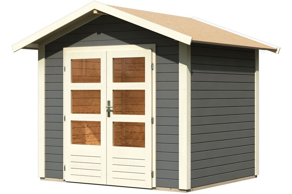 Das Gartenhaus Talkau in naturbelassen oder terragrau aus nordischer Fichte von KARIBU wird aus 28 mm Wandbrettern im Steck-/Schraubsystem gefertigt und kann somit rasch und einfach aufgebaut werden. Dabei ist es dank der breiten Wandbretter sehr stabil. Das praktische Satteldach aus Dachplatte sorgt dafür, dass das Gartenhaus schnell und wirkungsvoll gegen Witterungseinflüsse geschützt ist. Dank der Seitenhöhe von ca. 194 cm sorgt das Gartenhaus innen viel Platz. Kesseldruckimprägnierte Bodenbalken sorgen für optimalen Schutz gegen aufsteigende Feuchtigkeit. Durch die Positionierung unter dem Gartenhaus schützen die Bodenbalken effektiv vor Staunässe und Spritzwasser. Das Gartenhaus wird mit der, praktischerweise schon vormontierten Tür, im stabilen Massivholzrahmen ausgeliefert und bietet dank der großen Öffnung bequemen Zutritt in das Haus. Nebenbei bietet sie effektiven Schutz vor Diebstahl. Gleichzeitig lassen die großzügigen Lichtausschnitte im jeweiligen Türflügel ausreichend Tageslicht in das Gartenhaus einströmen.