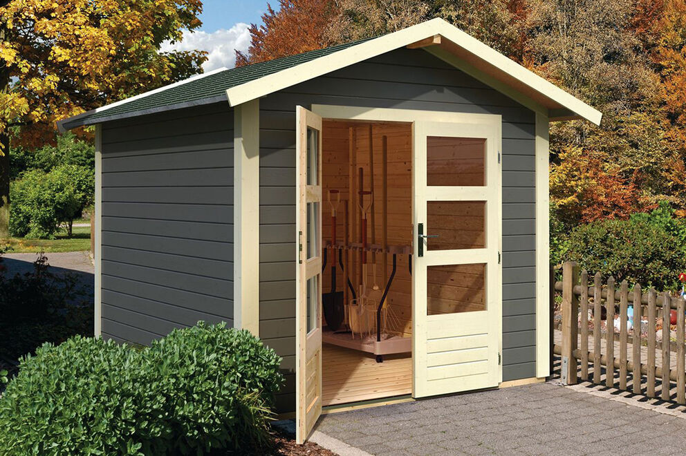 Das Gartenhaus Talkau in naturbelassen oder terragrau aus nordischer Fichte von KARIBU wird aus 28 mm Wandbrettern im Steck-/Schraubsystem gefertigt und kann somit rasch und einfach aufgebaut werden. Dabei ist es dank der breiten Wandbretter sehr stabil. Das praktische Satteldach aus Dachplatte sorgt dafür, dass das Gartenhaus schnell und wirkungsvoll gegen Witterungseinflüsse geschützt ist. Dank der Seitenhöhe von ca. 194 cm sorgt das Gartenhaus innen viel Platz. Kesseldruckimprägnierte Bodenbalken sorgen für optimalen Schutz gegen aufsteigende Feuchtigkeit. Durch die Positionierung unter dem Gartenhaus schützen die Bodenbalken effektiv vor Staunässe und Spritzwasser. Das Gartenhaus wird mit der, praktischerweise schon vormontierten Tür, im stabilen Massivholzrahmen ausgeliefert und bietet dank der großen Öffnung bequemen Zutritt in das Haus. Nebenbei bietet sie effektiven Schutz vor Diebstahl. Gleichzeitig lassen die großzügigen Lichtausschnitte im jeweiligen Türflügel ausreichend Tageslicht in das Gartenhaus einströmen.