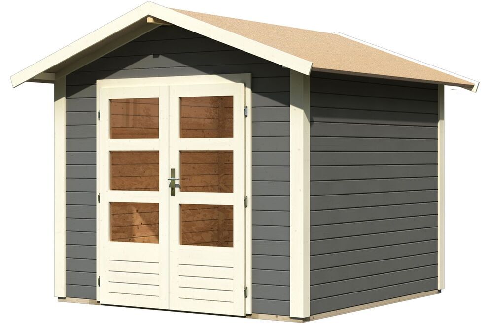 Das Gartenhaus Talkau in naturbelassen oder terragrau aus nordischer Fichte von KARIBU wird aus 28 mm Wandbrettern im Steck-/Schraubsystem gefertigt und kann somit rasch und einfach aufgebaut werden. Dabei ist es dank der breiten Wandbretter sehr stabil. Das praktische Satteldach aus Dachplatte sorgt dafür, dass das Gartenhaus schnell und wirkungsvoll gegen Witterungseinflüsse geschützt ist. Dank der Seitenhöhe von ca. 194 cm sorgt das Gartenhaus innen viel Platz. Kesseldruckimprägnierte Bodenbalken sorgen für optimalen Schutz gegen aufsteigende Feuchtigkeit. Durch die Positionierung unter dem Gartenhaus schützen die Bodenbalken effektiv vor Staunässe und Spritzwasser. Das Gartenhaus wird mit der, praktischerweise schon vormontierten Tür, im stabilen Massivholzrahmen ausgeliefert und bietet dank der großen Öffnung bequemen Zutritt in das Haus. Nebenbei bietet sie effektiven Schutz vor Diebstahl. Gleichzeitig lassen die großzügigen Lichtausschnitte im jeweiligen Türflügel ausreichend Tageslicht in das Gartenhaus einströmen.