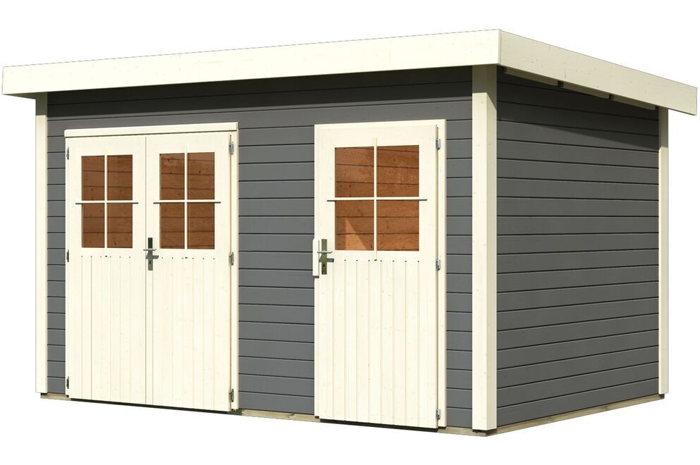 Das Gartenhaus Tintrup in naturbelassen oder terragrau aus nordischer Fichte von KARIBU wird aus 28 mm Wandbrettern im Steck-/Schraubsystem gefertigt und kann somit rasch und einfach aufgebaut werden. Dabei ist es dank der breiten Wandbretter sehr stabil. Das praktische Flachdach aus Massivholzdach sorgt dafür, dass das Gartenhaus schnell und wirkungsvoll gegen Witterungseinflüsse geschützt ist. Das Haus hat eine Grundfläche von ca. 8,6 m² und ca. 19,1 m³ umbauten Raum. Dank der Seitenhöhe von ca. 210 cm und einer Firsthöhe von ca. 230 cm sorgt das Gartenhaus innen viel Platz. Das Gartenhaus hat ein Sockelmaß von ca. 360 x 240 cm. Kesseldruckimprägnierte Bodenbalken sorgen für optimalen Schutz gegen aufsteigende Feuchtigkeit. Durch die Positionierung unter dem Gartenhaus schützen die Bodenbalken effektiv vor Staunässe und Spritzwasser. Das Gartenhaus wird mit der, praktischerweise schon vormontierten Tür, im stabilen Massivholzrahmen ausgeliefert und bietet dank der großen Öffnung bequemen Zutritt in das Haus. Nebenbei bietet sie effektiven Schutz vor Diebstahl. Gleichzeitig lassen die großzügigen Lichtausschnitte im jeweiligen Türflügel ausreichend Tageslicht in das Gartenhaus einströmen.