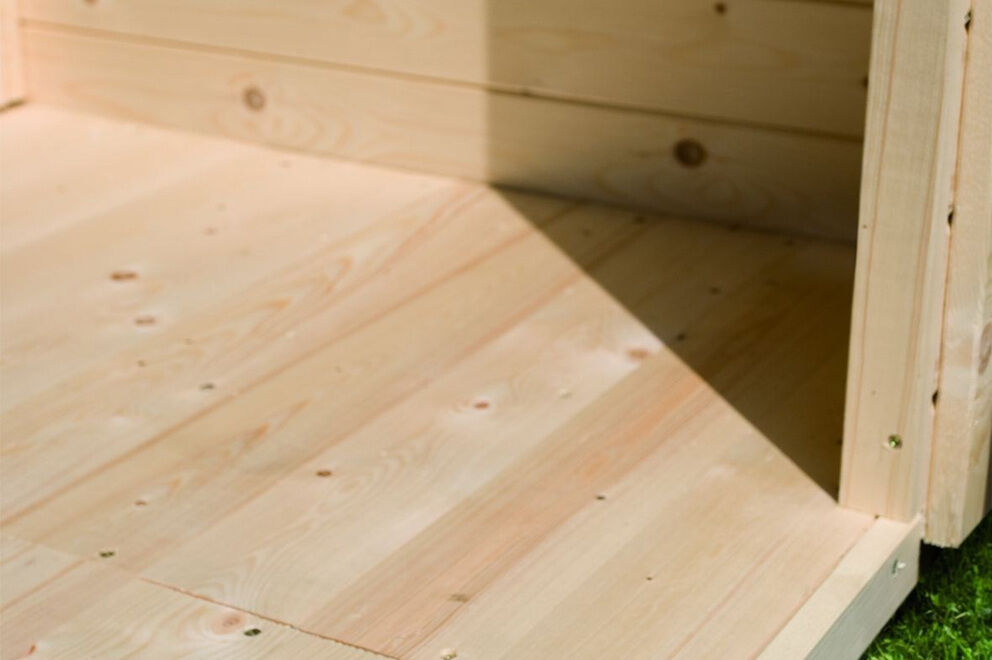 Den passende Fußboden für Ihr Gartenhaus von KARIBU erhalten Sie hier bei uns. Dieser präsentiert sich naturbelassen und aus einer Fichten-Massivholzkonstruktion. Außerdem verfügt dieser Boden über Nut und Feder. Als Unterkonstruktion dienen breite, kesseldruckimprägnierte Bodenbalken.