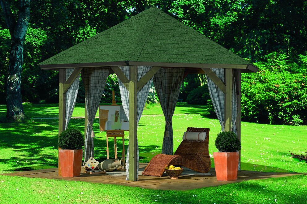 Der Pavillon Oslo 2 aus dem KARIBU-Sortiment hat eine sechseckige Grundform und bietet dank einem Außenmaß von ca. 324 x 370 cm viel Platz zum Sitzen, Entspannen und Feiern. Die Seitenhöhe beträgt ca. 196 cm bei einer Firsthöhe von ca. 315 cm. Die sechs Pfosten stützen mit massiven Querverbindern und Kopfbändern das optisch ansprechende Walmdach. Die jeweils ca. 11,5 x 11,5 cm breiten Pfosten sind kesseldruckimprägniert und somit gegen Pilze, holzzersetzende Insekten und andere Witterungseinflüsse bestens geschützt. Die Verwendung von hochwertigen, passenden H-Ankern mit einer Länge von ca. 60 cm wird auf Grund der großen Dachflächen und der Windlasten dringend empfohlen.