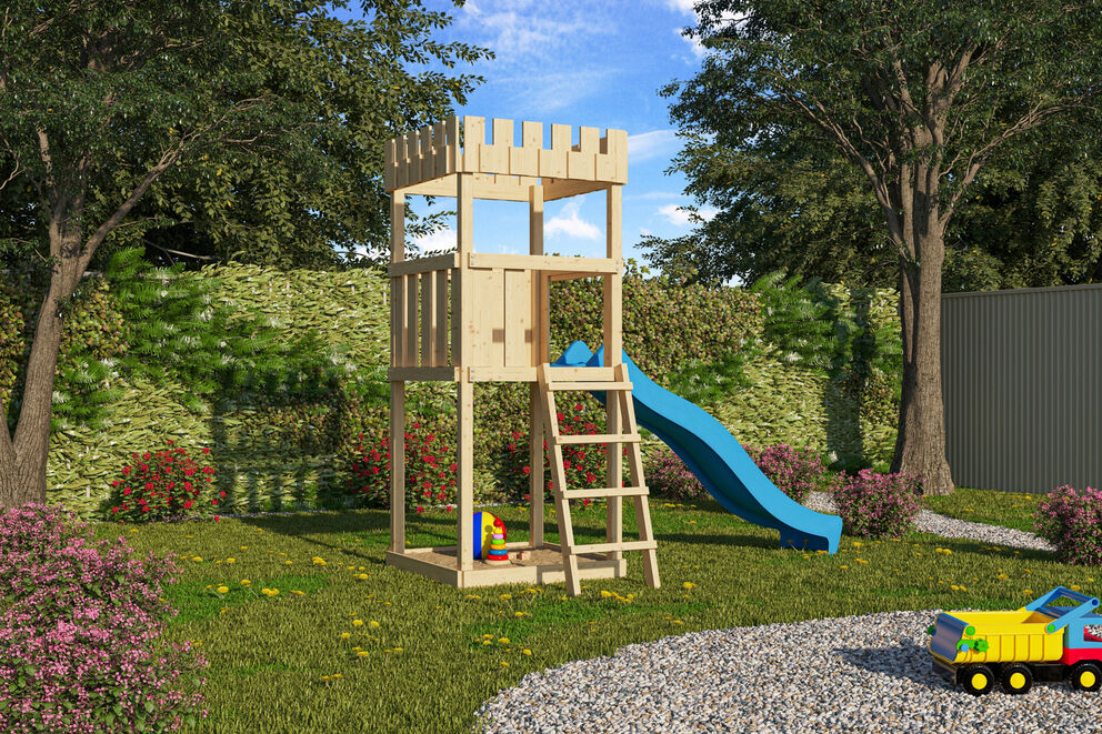 Die Ritterburg Löwenherz von KARIBU ist die ideale Wahl für alle kleinen Abenteurer und Abenteurerinnen, die hoch hinaus wollen. Bestes naturbelassenes nordisches Fichtenholz mit einer Grundkonstruktion aus ca. 6,8 x 6,8 cm starken Pfosten. Das Holz kommt aus dem hohen Norden Europas und ist absolut unbehandelt. Dadurch ist es frei von allen bekannten problematischen Substanzen, die bei Kesseldruckimprägnierungen in das Holz eindringen könnten. Die Podesthöhe von ca. 125 cm bietet beste Ausblicke und bringt die Phantasie Ihres Kindes zum Blühen. Das Satteldach und die Rüstungsbretter sind aus ca. 18 mm starken Bretterngefertigt und bieten hohe Stabilität und somit langlebige Sicherheit. Der Spielturm kann in diversen Kombinationen erworben werden und passt sich so Ihren Bedürfnissen an. Natürlich hat der Spielturm ein Zertifikat vom TÜV-Nord für geprüfte Sicherheit (GS) nach DIN EN 71-1, DIN EN 71-3, DIN EN 71-8 und AfPS GS 2014. Das riesige Zubehörsortiment sorgt dafür, dass Ihrer Phantasie keine Grenzen gesetzt sind. Als besonderes Highlight sind die außergewöhnlich schönen Farbsets zu nennen, die es Ihnen erlauben, die Ritterburg Löwenherz komplett einzigartig zu machen. Lassen Sie sich in der entsprechenden Zubehörrubrik inspirieren.