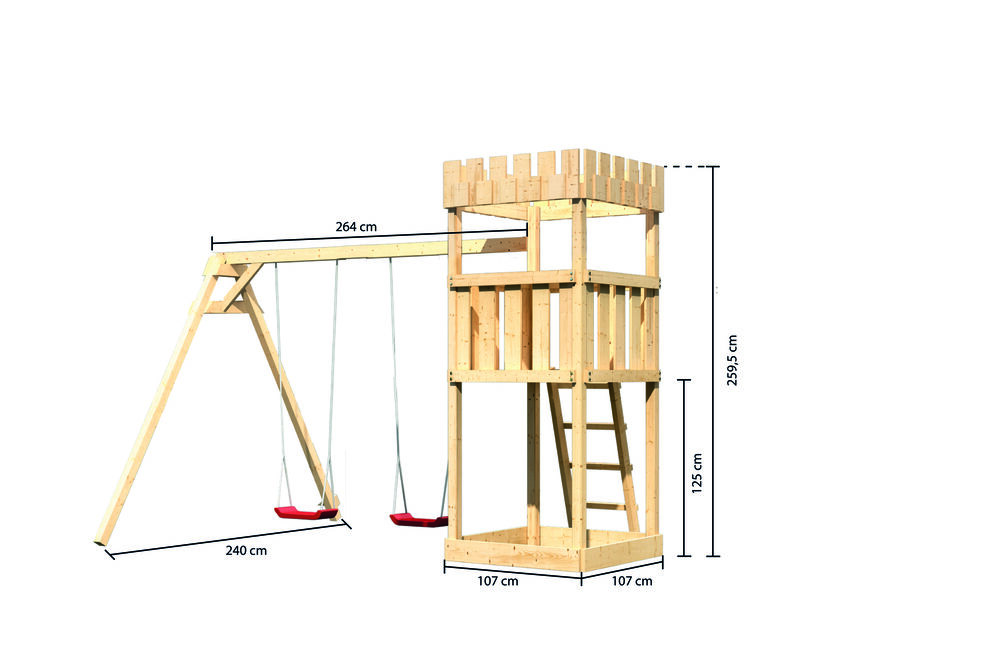 Die Ritterburg Löwenherz von KARIBU ist die ideale Wahl für alle kleinen Abenteurer und Abenteurerinnen, die hoch hinaus wollen. Bestes naturbelassenes nordisches Fichtenholz mit einer Grundkonstruktion aus ca. 6,8 x 6,8 cm starken Pfosten. Das Holz kommt aus dem hohen Norden Europas und ist absolut unbehandelt. Dadurch ist es frei von allen bekannten problematischen Substanzen, die bei Kesseldruckimprägnierungen in das Holz eindringen könnten. Die Podesthöhe von ca. 125 cm bietet beste Ausblicke und bringt die Phantasie Ihres Kindes zum Blühen. Das Satteldach und die Rüstungsbretter sind aus ca. 18 mm starken Bretterngefertigt und bieten hohe Stabilität und somit langlebige Sicherheit. Der Spielturm kann in diversen Kombinationen erworben werden und passt sich so Ihren Bedürfnissen an. Natürlich hat der Spielturm ein Zertifikat vom TÜV-Nord für geprüfte Sicherheit (GS) nach DIN EN 71-1, DIN EN 71-3, DIN EN 71-8 und AfPS GS 2014. Das riesige Zubehörsortiment sorgt dafür, dass Ihrer Phantasie keine Grenzen gesetzt sind. Als besonderes Highlight sind die außergewöhnlich schönen Farbsets zu nennen, die es Ihnen erlauben, die Ritterburg Löwenherz komplett einzigartig zu machen. Lassen Sie sich in der entsprechenden Zubehörrubrik inspirieren.
