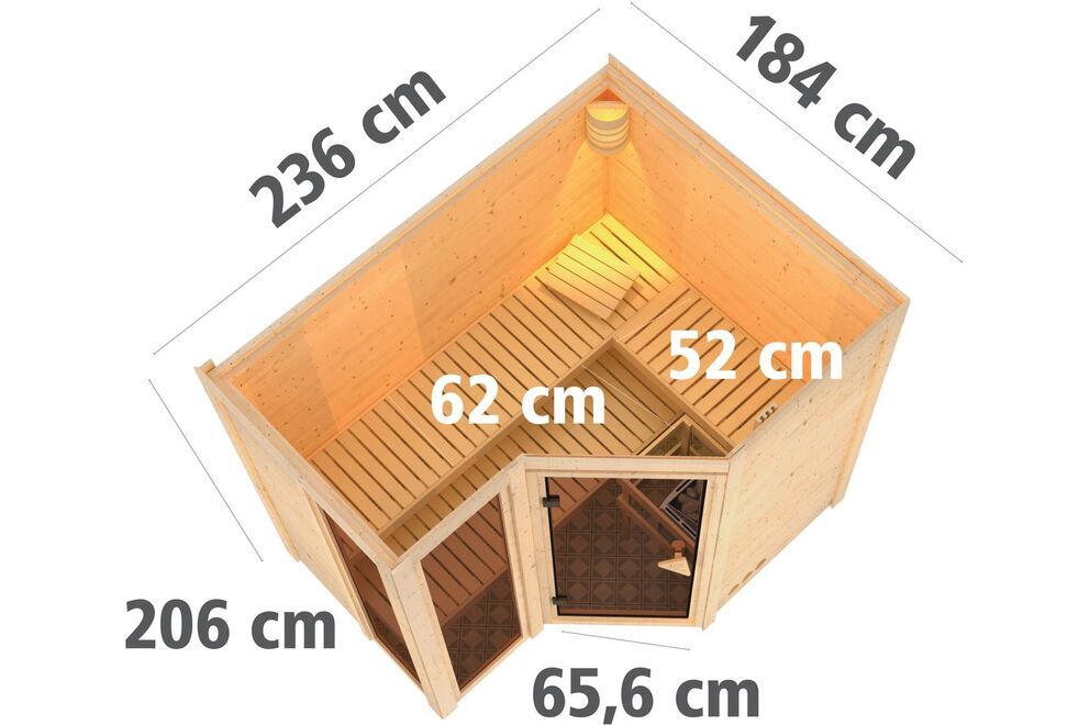 Die Massivholzsauna besticht durch Außenmaße von ca. 236 x 184 x 209 cm (mit Kranz ca. 264 x 198 x 212 cm), wodurch ein Innenmaß von ca. 225 x 173 x 200 cm resultiert. Nehmen Sie Platz in dieser Kabine und auf den drei Liegen, die ausreichend Platz spenden. Apropos Platz: diese Kabine verfügt über einen Rauminhalt von ca. 6,8 m³ bei einer Grundfläche von ca. 4 m². Ein weiterer Vorteil dieser Sauna ist, dass Sie diese frei im Raum positionieren können. Durch den Einsatz von vierseitig umlaufendem, besten Fichtenholz gibt es insgesamt vier Sichtseiten. Dadurch existiert quasi keine Rückwand. Abgerundet wird das Interieur durch drei Bänke und eine Kopfstütze