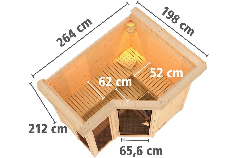 Die Massivholzsauna besticht durch Außenmaße von ca. 236 x 184 x 209 cm (mit Kranz ca. 264 x 198 x 212 cm), wodurch ein Innenmaß von ca. 225 x 173 x 200 cm resultiert. Nehmen Sie Platz in dieser Kabine und auf den drei Liegen, die ausreichend Platz spenden. Apropos Platz: diese Kabine verfügt über einen Rauminhalt von ca. 6,8 m³ bei einer Grundfläche von ca. 4 m². Ein weiterer Vorteil dieser Sauna ist, dass Sie diese frei im Raum positionieren können. Durch den Einsatz von vierseitig umlaufendem, besten Fichtenholz gibt es insgesamt vier Sichtseiten. Dadurch existiert quasi keine Rückwand. Abgerundet wird das Interieur durch drei Bänke und eine Kopfstütze