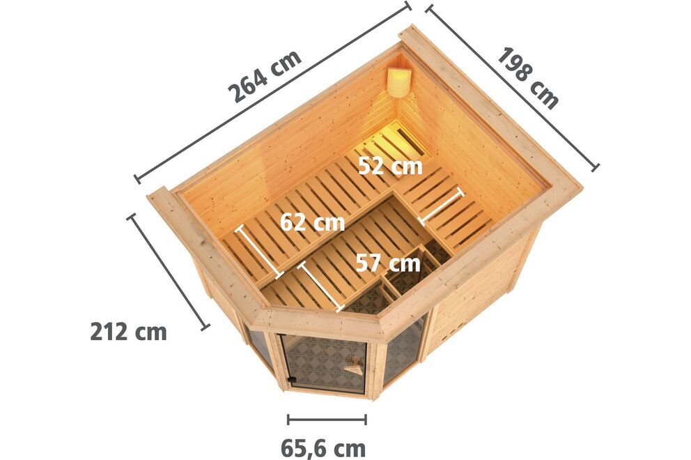 Die Massivholzsauna besticht durch Außenmaße von ca. 236 x 184 x 209 cm (mit Kranz ca. 264 x 198 x 212 cm), wodurch ein Innenmaß von ca. 225 x 173 x 200 cm resultiert. Nehmen Sie Platz in dieser Kabine und auf den drei Liegen, die ausreichend Platz spenden. Apropos Platz: diese Kabine verfügt über einen Rauminhalt von ca. 7,4 m³ bei einer Grundfläche von ca. 4 m². Ein weiterer Vorteil dieser Sauna ist, dass Sie diese frei im Raum positionieren können. Durch den Einsatz von vierseitig umlaufendem, besten Fichtenholz gibt es insgesamt vier Sichtseiten. Dadurch existiert quasi keine Rückwand. Abgerundet wird das Interieur durch drei Bänke und eine Kopfstütze