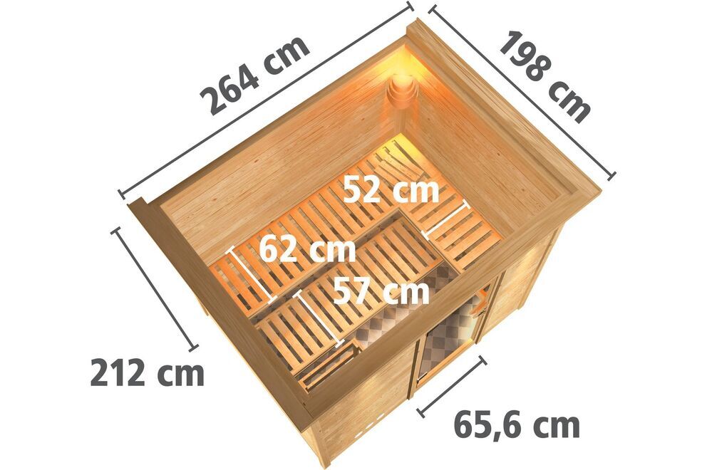 Die Massivholzsauna besticht durch Außenmaße von ca. 236 x 184 x 209 cm (mit Kranz ca. 264 x 198 x 212 cm), wodurch ein Innenmaß von ca. 225 x 173 x 200 cm resultiert. Nehmen Sie Platz in dieser Kabine und auf den drei Liegen, die ausreichend Platz spenden. Apropos Platz: diese Kabine verfügt über einen Rauminhalt von ca. 7,7 m³ bei einer Grundfläche von ca. 4,3 m². Ein weiterer Vorteil dieser Sauna ist, dass Sie diese frei im Raum positionieren können. Durch den Einsatz von vierseitig umlaufendem, besten Fichtenholz gibt es insgesamt vier Sichtseiten. Dadurch existiert quasi keine Rückwand. Abgerundet wird das Interieur durch drei Bänke und eine Kopfstütze