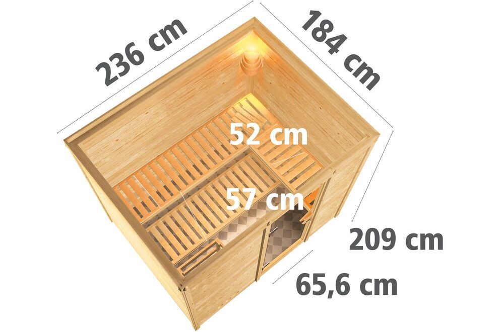 Die Massivholzsauna besticht durch Außenmaße von ca. 236 x 184 x 209 cm (mit Kranz ca. 264 x 198 x 212 cm), wodurch ein Innenmaß von ca. 225 x 173 x 200 cm resultiert. Nehmen Sie Platz in dieser Kabine und auf den drei Liegen, die ausreichend Platz spenden. Apropos Platz: diese Kabine verfügt über einen Rauminhalt von ca. 7,7 m³ bei einer Grundfläche von ca. 4,3 m². Ein weiterer Vorteil dieser Sauna ist, dass Sie diese frei im Raum positionieren können. Durch den Einsatz von vierseitig umlaufendem, besten Fichtenholz gibt es insgesamt vier Sichtseiten. Dadurch existiert quasi keine Rückwand. Abgerundet wird das Interieur durch drei Bänke und eine Kopfstütze