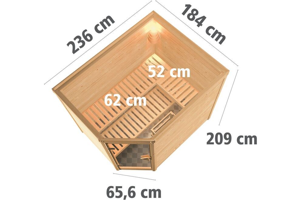 Die Massivholzsauna besticht durch Außenmaße von ca. 236 x 184 x 209 cm (mit Kranz ca. 264 x 198 x 212 cm), wodurch ein Innenmaß von ca. 225 x 173 x 200 cm resultiert. Nehmen Sie Platz in dieser Kabine und auf den drei Liegen, die ausreichend Platz spenden. Apropos Platz: diese Kabine verfügt über einen Rauminhalt von ca. 7,4 m³ bei einer Grundfläche von ca. 4 m². Ein weiterer Vorteil dieser Sauna ist, dass Sie diese frei im Raum positionieren können. Durch den Einsatz von vierseitig umlaufendem, besten Fichtenholz gibt es insgesamt vier Sichtseiten. Dadurch existiert quasi keine Rückwand. Abgerundet wird das Interieur durch drei Bänke und eine Kopfstütze
