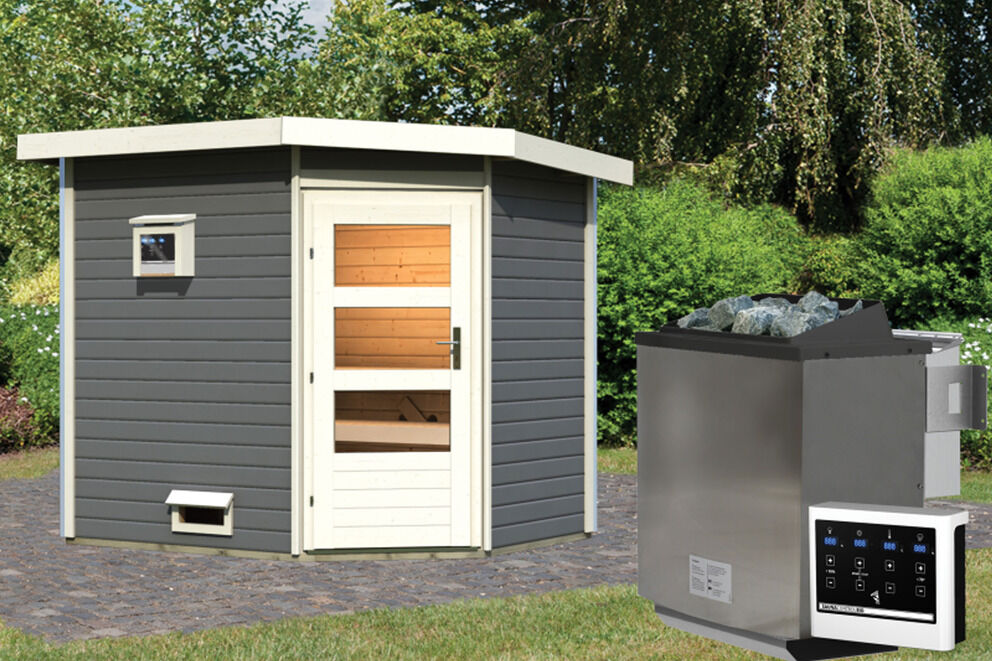 1x KARIBU 38 mm Saunahaus Mikka mit Eckeinstieg in verschiedenen Ausführungen inkl. Montageanleitung und -material