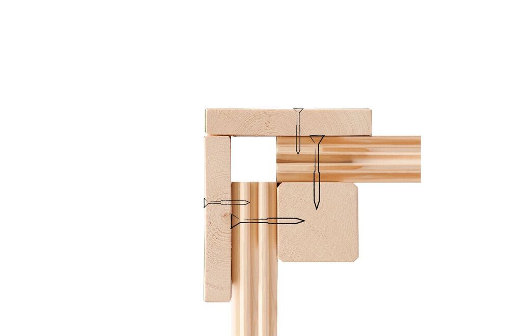 Das Gartenhaus Schönbuch2 aus nordischer Fichte von KARIBU wird aus 38 mm Wandbrettern im Steck-/Schraubsystem gefertigt und kann somit rasch und einfach aufgebaut werden. Das praktische Flachdach aus Massivholz sorgt dafür, dass das Gartenhaus schnell und wirkungsvoll gegen Witterungseinflüsse geschützt ist. Das Haus hat eine Grundfläche von ca. 11,48 m² und ca. 24,8 m³ umbauten Raum. Dank der Seitenhöhe von ca. 201 cm und einer Firsthöhe von ca. 222 cm sorgt das Haus innen für viel Platz. Das Gartenhaus hat ein Sockelmaß von ca. 422 x 272 cm. Kesseldruckimprägnierte Bodenbalken sorgen für optimalen Schutz gegen aufsteigende Feuchtigkeit. Durch die Positionierung unter dem Gartenhaus schützen die Bodenbalken effektiv vor Staunässe und Spritzwasser. Das Gartenhaus wird mit der, praktischerweise schon vormontierten Tür, im stabilen Massivholzrahmen ausgeliefert und bietet dank der großen Öffnung bequemen Zutritt in das Haus. Nebenbei bietet sie effektiven Schutz vor Diebstahl. Gleichzeitig lassen die großzügigen Lichtausschnitte im jeweiligen Türflügel ausreichend Tageslicht in das Gartenhaus einströmen.