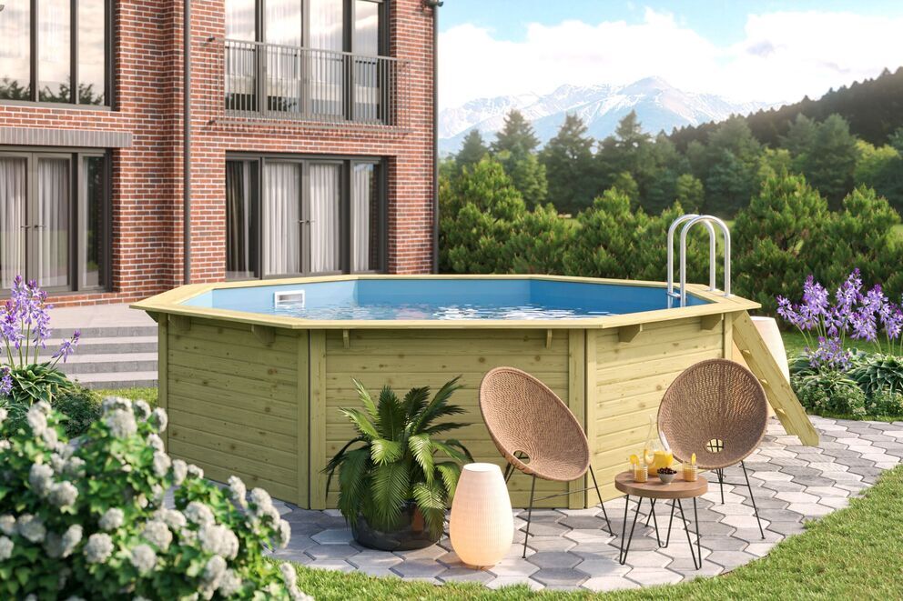 Der hochwertige Massivholzpool Modell 2X von KARIBU aus witterungsbeständigen und kesseldruckimprägnierten Blockbohlen mit einer Stärke von ca. 38 mm sorgt für Freibadfeeling in Ihrem Garten. Machen Sie sich unabhängig von überfüllten Einrichtungen oder langen Schlangen am Kiosk. Mit einer großen Wassertiefe von ca. 111 cm ist hier müheloses und bequemes Schwimmen möglich. Insgesamt warten hier ca. 15,95 m³ Wasserinhalt darauf, von Ihnen erobert zu werden. Die Großzügigkeit des Pools wird unterstrichen durch eine Diagonale von ca. 508 cm. Daraus entsteht ein Innenmaß von ca. 420 x 420 cm bei einem Außenmaß von ca. 428 x 428 cm stehen für sich. Eine hochwertige Poolfolie mit einer Stärke von ca. 0,6 mm ist im Lieferumfang enthalten. Diese Poolfolie wird bei den KARIBU Pools in eine praktische umlaufende Einhängebiese eingeklipst. Somit wird das Risiko der Faltenbildung minimiert und ein Austausch der Folie im Falle einer Beschädigung wird extrem vereinfacht. Diese Bauweise steht qualitativ deutlich über einer recht einfachen Vernagelung von Poolfolien, wie es andere Hersteller zum Teil tun. Unterhalb der Poolfolie wird ein Unterlegvlies mit einer Stärke von ca. 400 g/m² ausgelegt, welches auch mitgeliefert wird. Ebenfalls im Lieferumfang enthalten ist die hochwertige Edelstahl-Einhängeleiter und Bolzleiter für die Außenseite. Das ca. 26 mm dicke Deck an der Oberseite des Pools als Handlauf sorgt für einen schönen und harmonischen Abschluss.