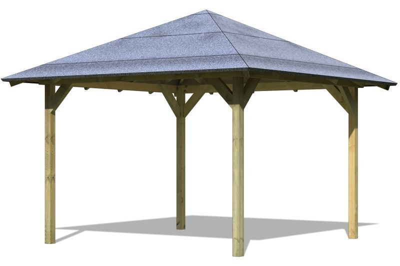 Der Pavillon Cordoba aus dem KARIBU-Sortiment hat eine quadratische Grundform und bietet dank einem Außenmaß von ca. 289 x 289 cm viel Platz zum Sitzen, Entspannen und Feiern. Dafür sorgt darüber hinaus noch das Dachstandmaß von ca. 357 x 357 cm, was man im Pavillonbereich sinnvollerweise mit nutzen kann. Die Seitenhöhe beträgt ca. 199 cm bei einer Firsthöhe von ca. 297 cm. Die vier Pfosten stützen mit massiven Querverbindern und Kopfbändern das optisch ansprechende Walmdach. Die jeweils ca. 9 x 9 cm breiten Pfosten sind kesseldruckimprägniert und somit gegen Pilze, holzzersetzende Insekten und andere Witterungseinflüsse bestens geschützt. Die Verwendung von hochwertigen, passenden H-Ankern mit einer Länge von ca. 60 cm wird auf Grund der großen Dachflächen und der Windlasten dringend empfohlen.
