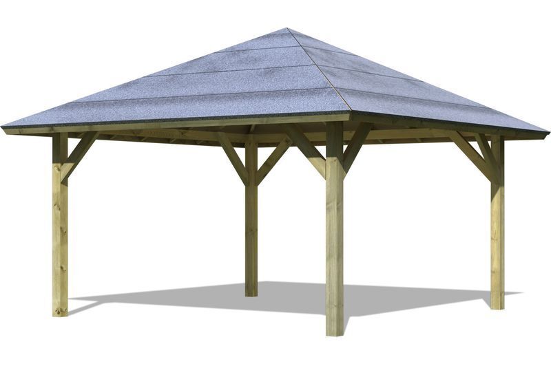 Der Pavillon Holm 1 aus dem KARIBU-Sortiment hat eine quadratische Grundform und bietet dank einem Außenmaß von ca. 359 x 359 cm viel Platz zum Sitzen, Entspannen und Feiern. Dafür sorgt darüber hinaus noch das Dachstandmaß von ca. 431 x 431 cm, was man im Pavillonbereich sinnvollerweise mit nutzen kann. Die Seitenhöhe beträgt ca. 196 cm bei einer Firsthöhe von ca. 315 cm. Die vier Pfosten stützen mit massiven Querverbindern und Kopfbändern das optisch ansprechende Walmdach. Die jeweils ca. 11,5 x 11,5 cm breiten Pfosten sind kesseldruckimprägniert und somit gegen Pilze, holzzersetzende Insekten und andere Witterungseinflüsse bestens geschützt. Die Verwendung von hochwertigen, passenden H-Ankern mit einer Länge von ca. 60 cm wird auf Grund der großen Dachflächen und der Windlasten dringend empfohlen.