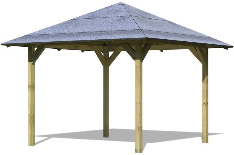 Der Pavillon Sevilla aus dem KARIBU-Sortiment hat eine quadratische Grundform und bietet dank einem Außenmaß von ca. 265 x 265 cm viel Platz zum Sitzen, Entspannen und Feiern. Dafür sorgt darüber hinaus noch das Dachstandmaß von ca. 340 x 340 cm, was man im Pavillonbereich sinnvollerweise mit nutzen kann. Die Seitenhöhe beträgt ca. 199 cm bei einer Firsthöhe von ca. 290 cm. Die vier Pfosten stützen mit massiven Querverbindern und Kopfbändern das optisch ansprechende Walmdach. Die jeweils ca. 9 x 9 cm breiten Pfosten sind kesseldruckimprägniert und somit gegen Pilze, holzzersetzende Insekten und andere Witterungseinflüsse bestens geschützt. Die Verwendung von hochwertigen, passenden H-Ankern mit einer Länge von ca. 60 cm wird auf Grund der großen Dachflächen und der Windlasten dringend empfohlen.