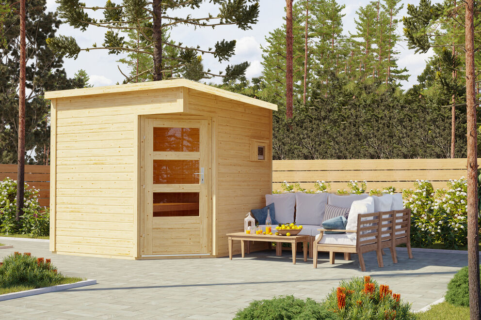 Das Saunahaus Pelle aus nordischer Fichte von KARIBU wird aus 38 mm Wandbrettern im Steck-/Schraubsystem gefertigt und kann somit rasch und einfach aufgebaut werden. Das praktische Pultdach aus Massivholz sorgt dafür, dass das Saunahaus schnell und wirkungsvoll gegen Witterungseinflüsse geschützt ist. Mit ihren Außenmaßen von ca. 231 x 231 x 227 cm und den Innenmaßen von ca. 219 x 219 x 190 cm, einer Grundfläche von 4,7 m² und einem umbauten Raum von 10,6 m³ bietet diese Sauna für alle Anforderungen ausreichend Platz. Auch der geräumige Vorraum lädt zum geschützten Verweilen und Entspannen zwischen den Saunagängen ein.