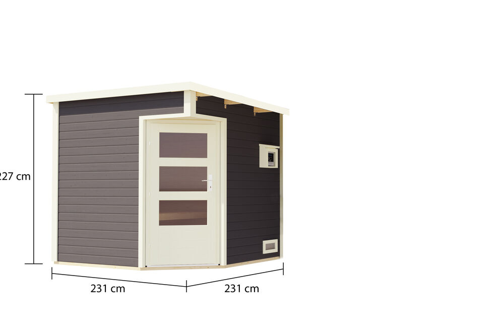 Das Saunahaus Pelle aus nordischer Fichte von KARIBU wird aus 38 mm Wandbrettern im Steck-/Schraubsystem gefertigt und kann somit rasch und einfach aufgebaut werden. Das praktische Pultdach aus Massivholz sorgt dafür, dass das Saunahaus schnell und wirkungsvoll gegen Witterungseinflüsse geschützt ist. Mit ihren Außenmaßen von ca. 231 x 231 x 227 cm und den Innenmaßen von ca. 219 x 219 x 190 cm, einer Grundfläche von 4,7 m² und einem umbauten Raum von 10,6 m³ bietet diese Sauna für alle Anforderungen ausreichend Platz. Auch der geräumige Vorraum lädt zum geschützten Verweilen und Entspannen zwischen den Saunagängen ein.