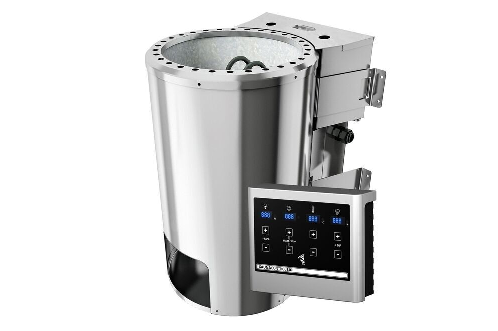 Karibu liefert mit dem BIO-Kombiofen einen Saunaofen aus hochwertigem Edelstahl, der sich über eine externe Steuerung auf eine Temperatur zwischen ca. 50°C und 80°C einstellen lässt. Das ermöglicht vier verschiedene Saunavarianten.