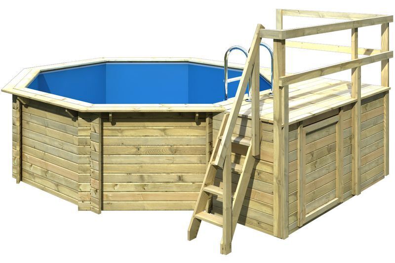 Der hochwertige Massivholzpool Modell 1 von KARIBU aus witterungsbeständigen und kesseldruckimprägnierten Blockbohlen mit einer Stärke von ca. 38 mm sorgt für Freibadfeeling in Ihrem Garten. Machen Sie sich unabhängig von überfüllten Einrichtungen oder langen Schlangen am Kiosk. Mit einer großen Wassertiefe von ca. 111 cm ist hier müheloses und bequemes Schwimmen möglich. Insgesamt warten hier ca. 11,3 m³ Wasserinhalt darauf, von Ihnen erobert zu werden. Die Großzügigkeit des Pools wird unterstrichen durch eine Diagonale von ca. 433 cm. Daraus entsteht ein Innenmaß von ca. 346 x 346 cm bei einem Außenmaß von ca. 358 x 358 cm stehen für sich. Eine hochwertige Poolfolie mit einer Stärke von ca. 0,6 mm ist im Lieferumfang enthalten. Diese Poolfolie wird bei den KARIBU Pools in eine praktische umlaufende Einhängebiese eingeklipst. Somit wird das Risiko der Faltenbildung minimiert und ein Austausch der Folie im Falle einer Beschädigung wird extrem vereinfacht. Diese Bauweise steht qualitativ deutlich über einer recht einfachen Vernagelung von Poolfolien, wie es andere Hersteller zum Teil tun. Unterhalb der Poolfolie wird ein Unterlegvlies mit einer Stärke von ca. 400 g/m² ausgelegt, welches auch mitgeliefert wird. Ebenfalls im Lieferumfang enthalten ist die hochwertige Edelstahl-Einhängeleiter und Bolzleiter für die Außenseite. Das ca. 26 mm dicke Deck an der Oberseite des Pools als Handlauf sorgt für einen schönen und harmonischen Abschluss.