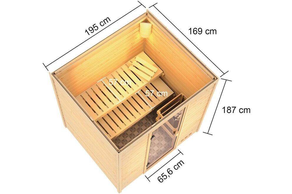Die KARIBU Holzsaunen mit 38 mm starken Massivholzbrettern aus hochwertiger nordischer Fichte wird im einfachen Steck-/Schraubsystem errichtet. Durch die hochwertige Saunatür gelangen Sie nach erfolgter Montage in den Innenraum. Auch bei den Massivholzsaunen im Steck-/Schraubsystem sind alle Seitenwände aus massivem Fichtenholz gefertigt, sodass kleine Hartfaserplatten zum Einsatz kommen (außer im Dachbereich). Die Sauna mit den vier Sichtseiten können beliebig im Raum platziert werden. Die Dachplatten bestehen aus 57 mm Elementbauweise mit Mineralwolldämmung.