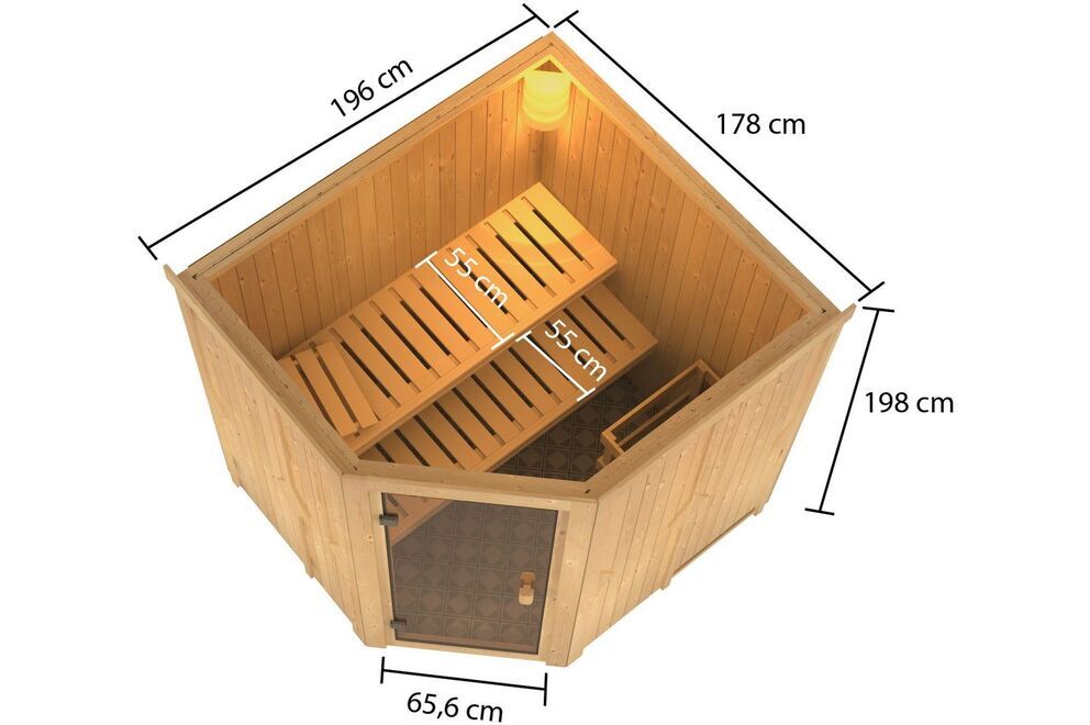 Diese Elementsauna von KARIBU bietet dank ihrer Wandstärke von 68 mm und der im Wandelement eingebauten Mineralwolldämmung eine hervorragende Energieeffizienz. Die vorgefertigten Wandelemente, die außen mit Softline-Profilholz verkleidet sind, sind leichter als Holz und haben gleichzeitig einen höheren Dämmwert. Darüber hinaus sind Saunen mit diesem Wandaufbau günstiger als die Produkte aus Vollholz. Durch die formschöne Saunatür gelangen Sie ins Innere der Kabine. Die Liegen sind ausreichend breit bemessen und bieten Ihnen die nötige Entspannung. Die Elementsaunen haben zwei Sichtseiten und zwei Seiten, welche mit einer Hartfaserplatte ausgestattet sind.