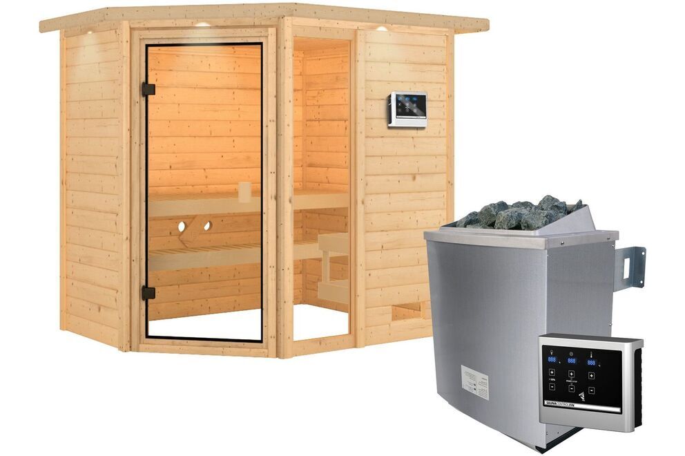 Eckeinstieg-Massivholzsauna inklusive zwei Liegen und Ofenschutzgitter