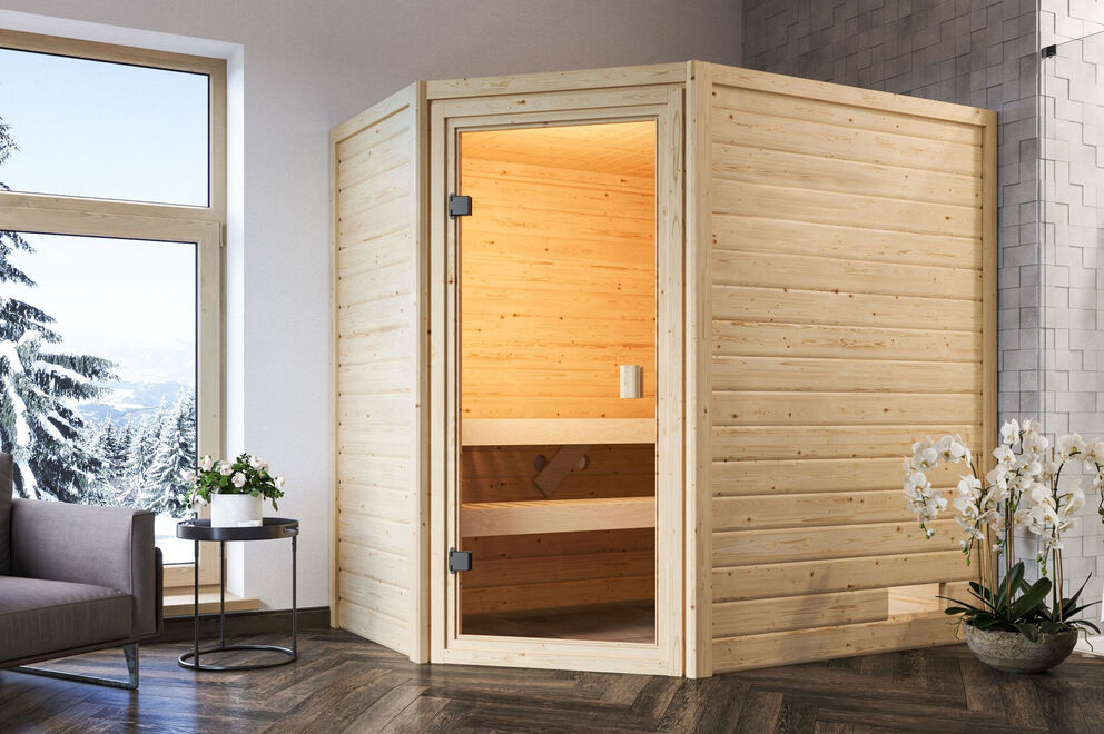 Eckeinstieg-Massivholzsauna inklusive zwei Liegen und Ofenschutzgitter
