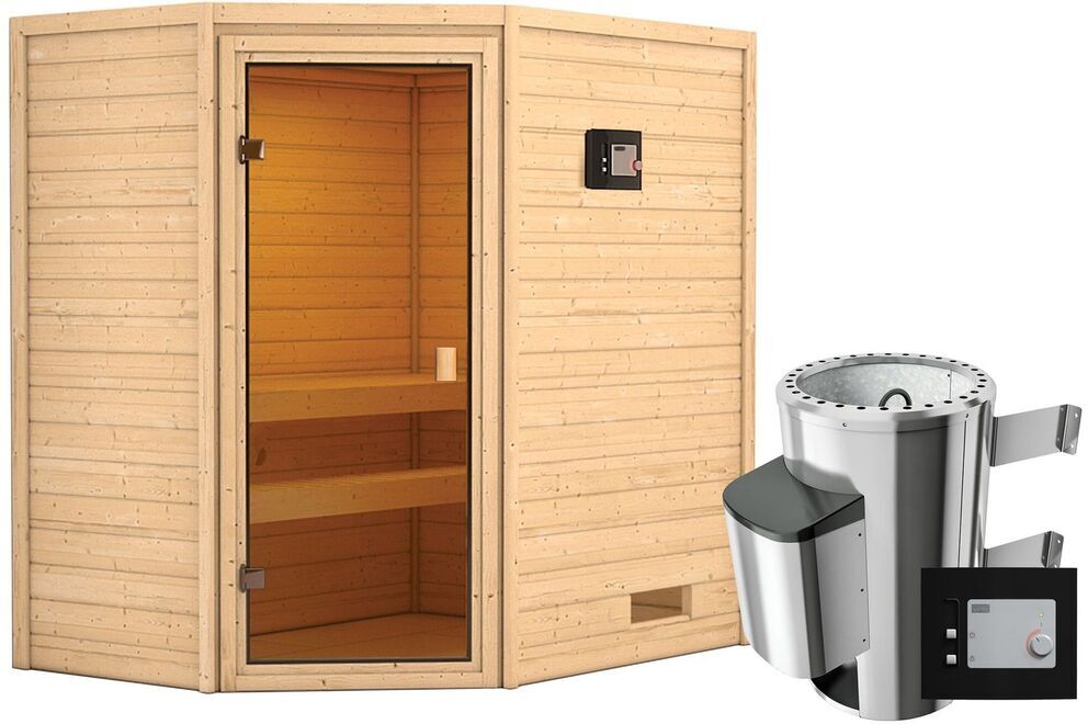 Eckeinstieg-Massivholzsauna inklusive zwei Liegen und Ofenschutzgitter
