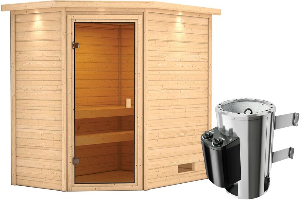 Eckeinstieg-Massivholzsauna inklusive zwei Liegen und Ofenschutzgitter