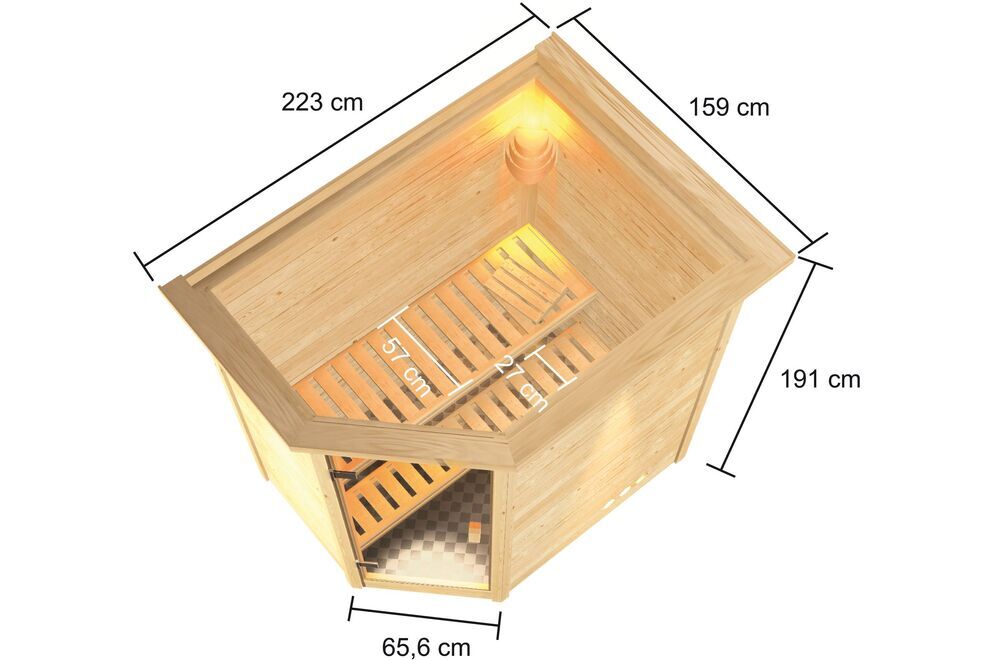 Eckeinstieg-Massivholzsauna inklusive zwei Liegen und Ofenschutzgitter