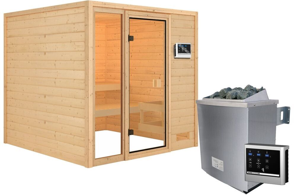 Die KARIBU Holzsaunen mit 38 mm starken Massivholzbrettern aus hochwertiger nordischer Fichte wird im einfachen Steck-/Schraubsystem errichtet. Durch die hochwertige Saunatür gelangen Sie nach erfolgter Montage in den Innenraum. Auch bei den Massivholzsaunen im Steck-/Schraubsystem sind alle Seitenwände aus massivem Fichtenholz gefertigt, sodass kleine Hartfaserplatten zum Einsatz kommen (außer im Dachbereich). Die Sauna mit den vier Sichtseiten können beliebig im Raum platziert werden. Die Dachplatten bestehen aus 57 mm Elementbauweise mit Mineralwolldämmung.