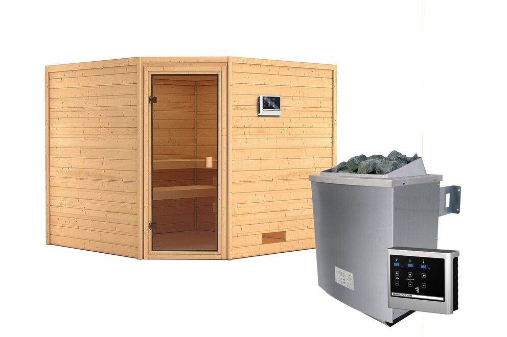 Eckeinstieg-Massivholzsauna inklusive drei Liegen und Ofenschutzgitter