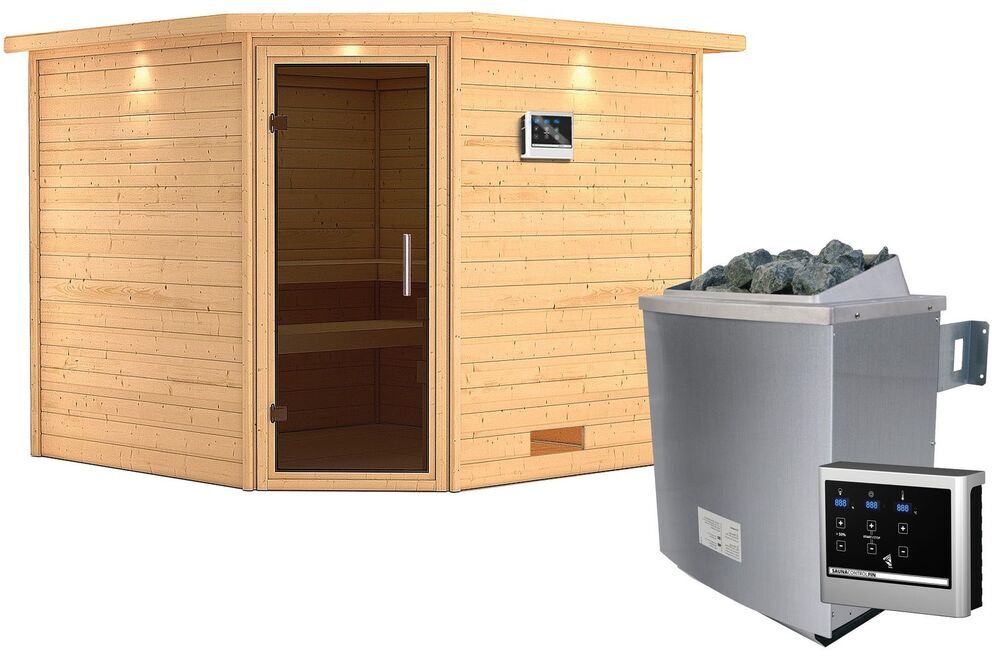 Eckeinstieg-Massivholzsauna inklusive drei Liegen und Ofenschutzgitter