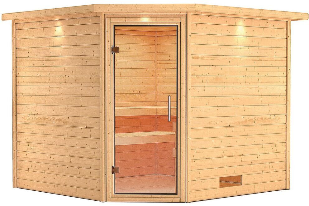Eckeinstieg-Massivholzsauna inklusive drei Liegen und Ofenschutzgitter