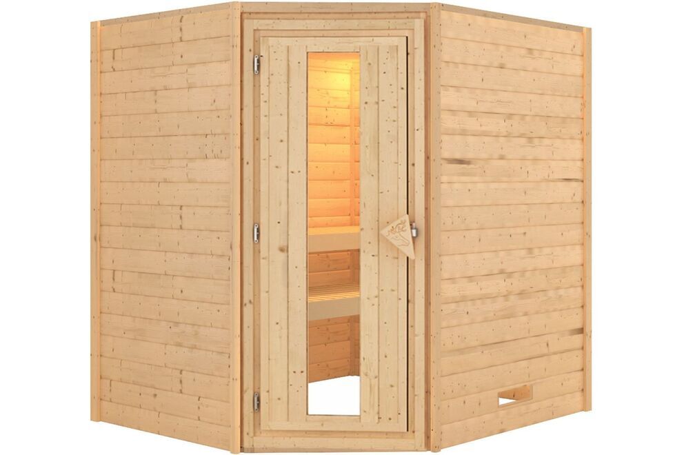 Eckeinstieg-Massivholzsauna inklusive zwei Liegen und Ofenschutzgitter