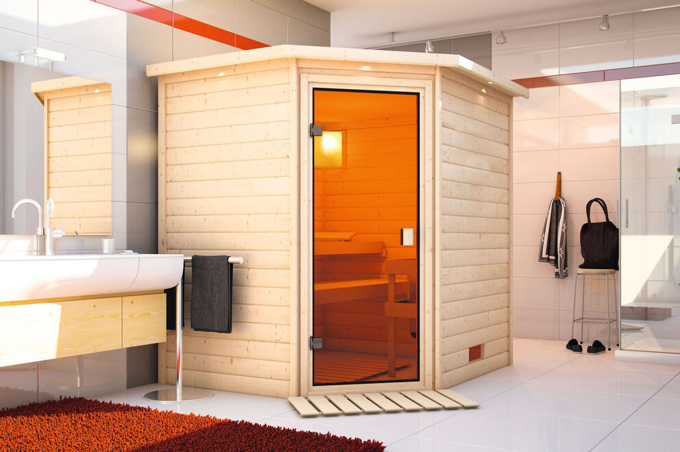 Eckeinstieg-Massivholzsauna inklusive zwei Liegen und Ofenschutzgitter