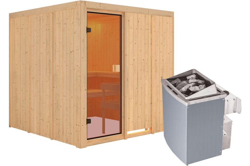 Diese Elementsauna von KARIBU bietet dank ihrer Wandstärke von 68 mm und der im Wandelement eingebauten Mineralwolldämmung eine hervorragende Energieeffizienz. Die vorgefertigten Wandelemente, die außen mit Softline-Profilholz verkleidet sind, sind leichter als Holz und haben gleichzeitig einen höheren Dämmwert. Darüber hinaus sind Saunen mit diesem Wandaufbau günstiger als die Produkte aus Vollholz. Durch die formschöne Saunatür gelangen Sie ins Innere der Kabine. Die Liegen sind ausreichend breit bemessen und bieten Ihnen die nötige Entspannung. Die Elementsaunen haben zwei Sichtseiten und zwei Seiten, welche mit einer Hartfaserplatte ausgestattet sind.