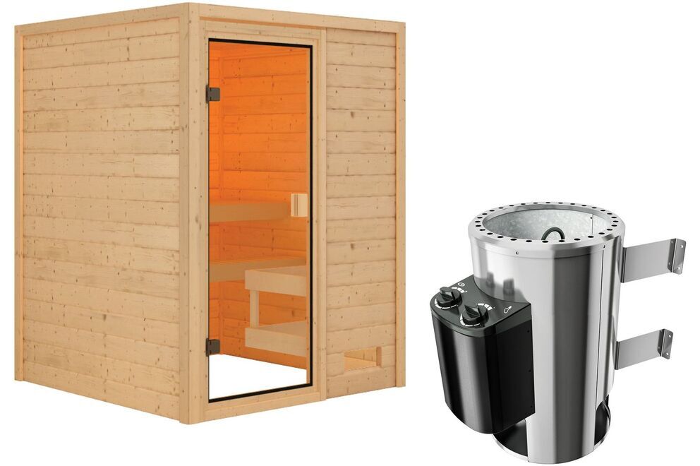 Fronteinstieg-Massivholzsauna inklusive zwei Liegen und Ofenschutzgitter