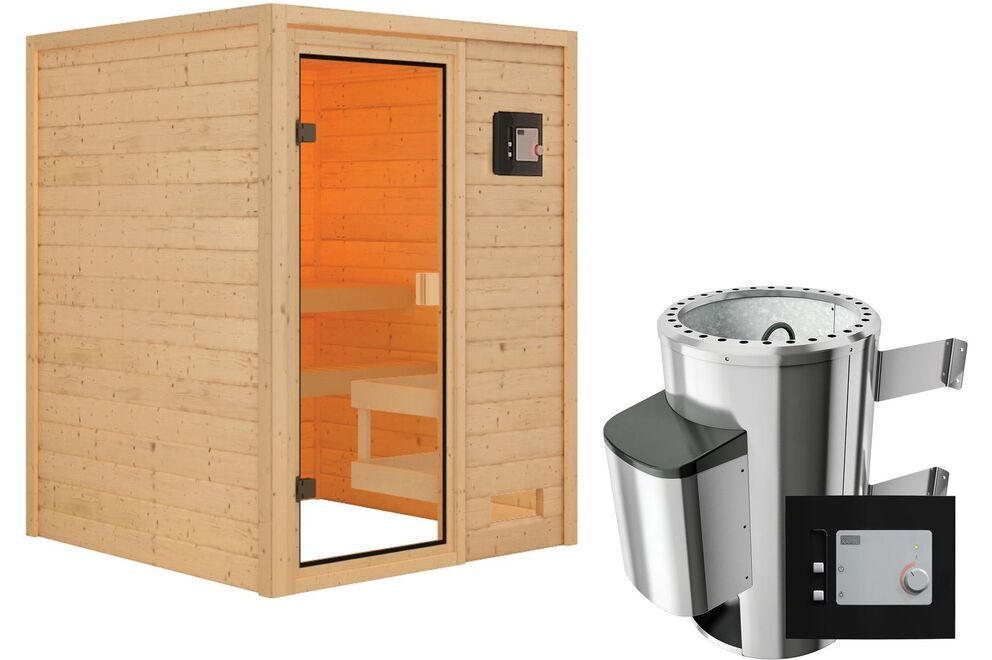 Die KARIBU Holzsaunen mit 38 mm starken Massivholzbrettern aus hochwertiger nordischer Fichte wird im einfachen Steck-/Schraubsystem errichtet. Durch die hochwertige Saunatür gelangen Sie nach erfolgter Montage in den Innenraum. Auch bei den Massivholzsaunen im Steck-/Schraubsystem sind alle Seitenwände aus massivem Fichtenholz gefertigt, sodass kleine Hartfaserplatten zum Einsatz kommen (außer im Dachbereich). Die Sauna mit den vier Sichtseiten können beliebig im Raum platziert werden. Die Dachplatten bestehen aus 57 mm Elementbauweise mit Mineralwolldämmung.