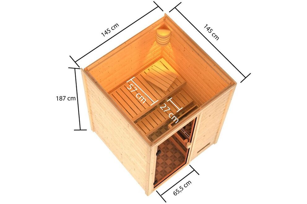 Die KARIBU Holzsaunen mit 38 mm starken Massivholzbrettern aus hochwertiger nordischer Fichte wird im einfachen Steck-/Schraubsystem errichtet. Durch die hochwertige Saunatür gelangen Sie nach erfolgter Montage in den Innenraum. Auch bei den Massivholzsaunen im Steck-/Schraubsystem sind alle Seitenwände aus massivem Fichtenholz gefertigt, sodass kleine Hartfaserplatten zum Einsatz kommen (außer im Dachbereich). Die Sauna mit den vier Sichtseiten können beliebig im Raum platziert werden. Die Dachplatten bestehen aus 57 mm Elementbauweise mit Mineralwolldämmung.