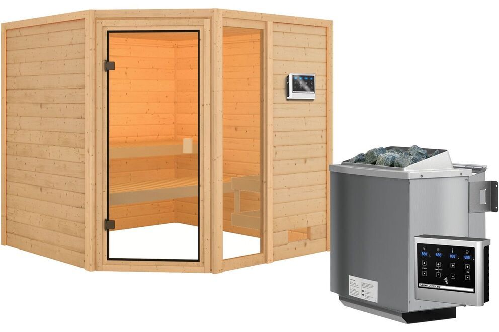Eckeinstieg-Massivholzsauna inklusive zwei Liegen und Ofenschutzgitter